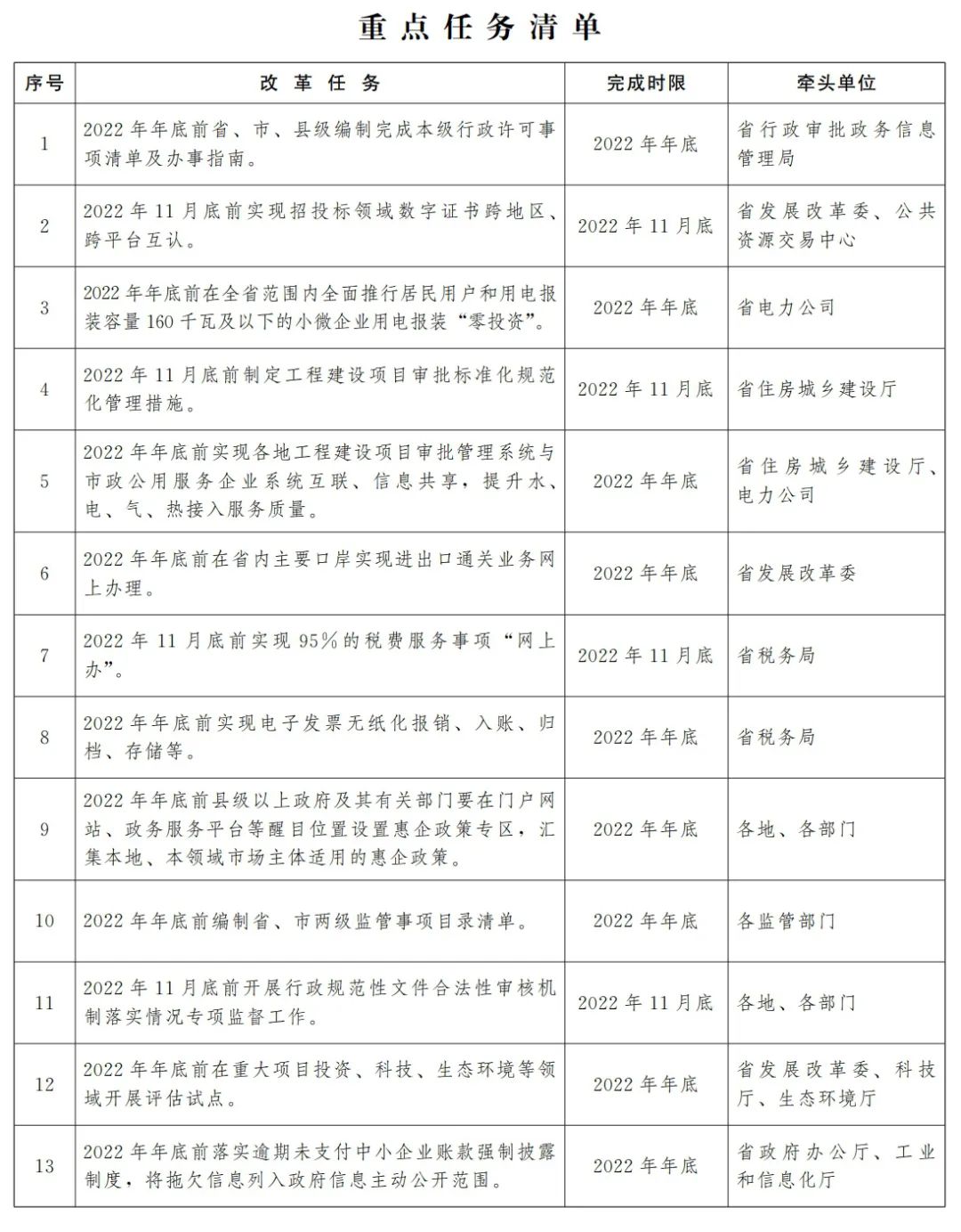 (一)全面实施市场准入负面清单管理。严格落实“全国一张清单”管理要求,按照国家部署,推动清单事项全部实现网上办理。清理带有市场准入限制的显性和隐性壁垒,健全违背市场准入负面清单案例归集和通报制度,畅通市场主体对各类市场准入问题的反映渠道。对性质严重的案例和情况,实行点对点通报约谈。深入实施外商投资准入前国民待遇加负面清单管理制度,在自由贸易试验区先行推动跨境服务贸易负面清单制度落实。(省发展改革委、商务厅牵头,省直有关部门按职责分工负责)